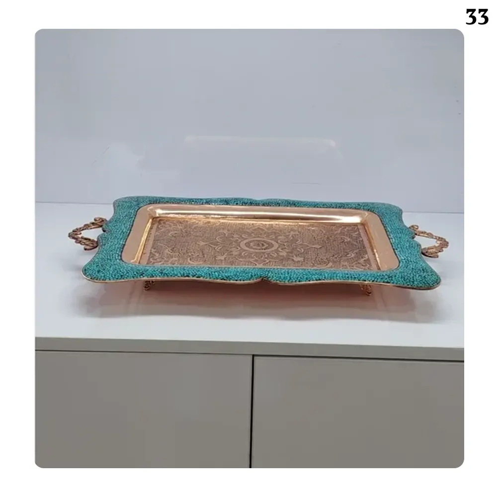 تُعد هذه الصينية من أجمل وأدوم تجليات الفن الإيراني الأصيل، حيث تجمع بين لمعان النحاس وهدوء لون الفيروز النيشابوري لتقدم قطعة جذابة وعملية. مصنوعة من النحاس عالي الجودة، بارتفاع ٣ سم وأبعاد ٤٩ × ٣٢ سم، وتزن حوالي ١٥٠٠ غرام، مما يجعلها مثالية للاستخدام الزخرفي والعملي. تم تزيين سطحها بدقة ومهارة على يد حرفيين محترفين بأحجار الفيروز الأصلية، التي رُصفت بشكل منتظم وناعم لتمنح الصينية مظهراً متناسقاً ومشرقاً وطبيعياً. النحاس المستخدم يتميز بمتانته ومقاومته لتغير اللون، مما يضمن الحفاظ على جماله وبريقه لفترة طويلة دون الحاجة إلى عناية معقدة.