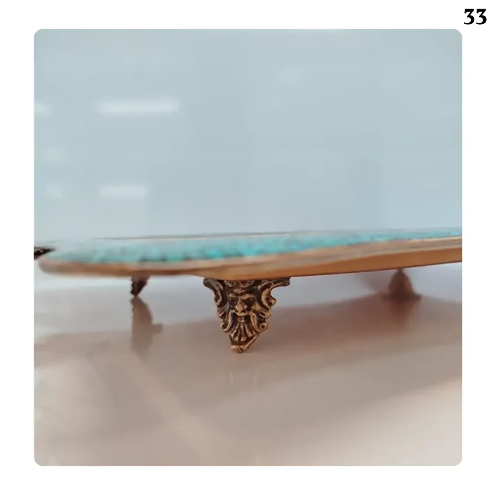 إلى جانب مظهرها الجذاب، تتميز هذه الصينية النحاسية المرصعة بالفيروز بمتانة عالية، مما يجعلها مناسبة للعرض الزخرفي ولتقديم الضيافة اليومية. تم تصميم الحواف والسطح بدقة لضمان جمال الشكل وسهولة وأمان الاستخدام. تضفي أحجار الفيروز النيشابوري الأصلية لمسة طبيعية وخالدة على المنتج، ليس فقط بلونها الأزرق الهادئ وأصالتها الثقافية، بل أيضاً بقدرتها على مقاومة التغيرات البيئية.